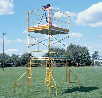 The Deluxe Coaches Tower is a sturdy 12′ steel platform that provides a vantage for practice and filming. The scaffold style construction has adjustable jacks for leveling and rails for safety. The platform has plenty of space measuring 7’L x 5’W. A built-in ladder provides safe, easy access to the platform.