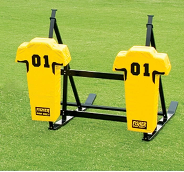 This Fisher CL JV 2 man sled is ideal for middle school through high school programs because of its TITE-LOCK modular chassis that provides the rigidity needed in a multi-unit sled. Player safety is improved due to the wraparound design of the Man Pads.The main frame is tough, durable and guaranteed to last for 5 years. The all metal surfaces are powder coated to prevent rust and the leaf spring design virtually eliminates all spring cracking and breaking. The 30 degree angle on the skids assures you of a smooth transition over your field without chewing up your turf or grass. The high density, 100lb impact resistant foam is covered with durable 18oz vinyl covers that are then double and triple stitched to withstand harsh weather and years of hard use.