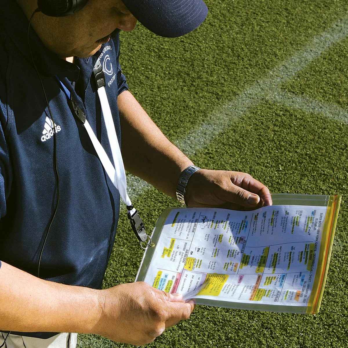 The 8.5″ x 14″ third hand coach is a legal size three pack of standard size game plan protectors. Have you ever wished that you had a third hand during games or practices? The Fisher Coach’s 3rd Hand is the answer! No more folding, rolling, or laminating.This is an indispensable aid for practice or games because it protects your game plan in all weather conditions with a zip lock seal. Easily write your adjustments on the vinyl pocket with a grease pencil. The detachable and adjustable lanyard keeps your hands free while you work.