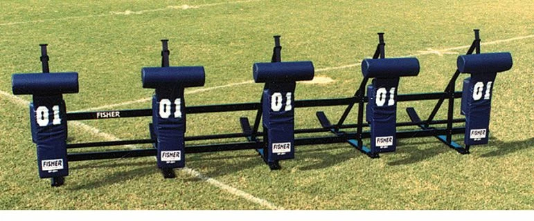 This Fisher CL JV 5 man T-Pad sled is ideal for middle school through high school programs because of its TITE-LOCK modular chassis that provides the rigidity needed in a multi-unit sled. Player safety is improved due to the wraparound design of the T Pads.The main frame is tough, durable and guaranteed to last for 5 years. The all metal surfaces are powder coated to prevent rust and the leaf spring design virtually eliminates all spring cracking and breaking. The 30 degree angle on the skids assures you of a smooth transition over your field without chewing up your turf or grass. The high density, 100lb impact resistant foam is covered with durable 18oz vinyl covers that are then double and triple stitched to withstand harsh weather and years of hard use.