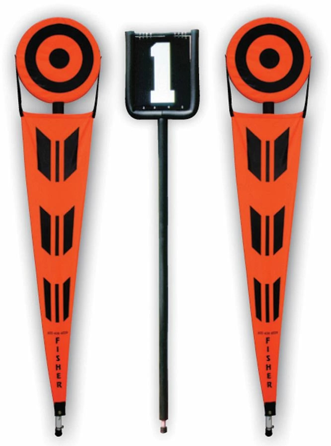 This Fisher chain is durable, safe and meets all NCAA and NFHSA regulations. To protect players, the bullseyes are made with a 4″ thick polyfoam and the bottom of the poles have crutch tips. The down indicator is constructed from a 7′ PVC piping pole wrapped in 3/4″ thick closed cell foam to ensure durability and safety. For easy visibility, the 7’H economy flip indicators have a 12″ tall 1 color number. The set includes a 7’H economy chain set and 2 down indicators