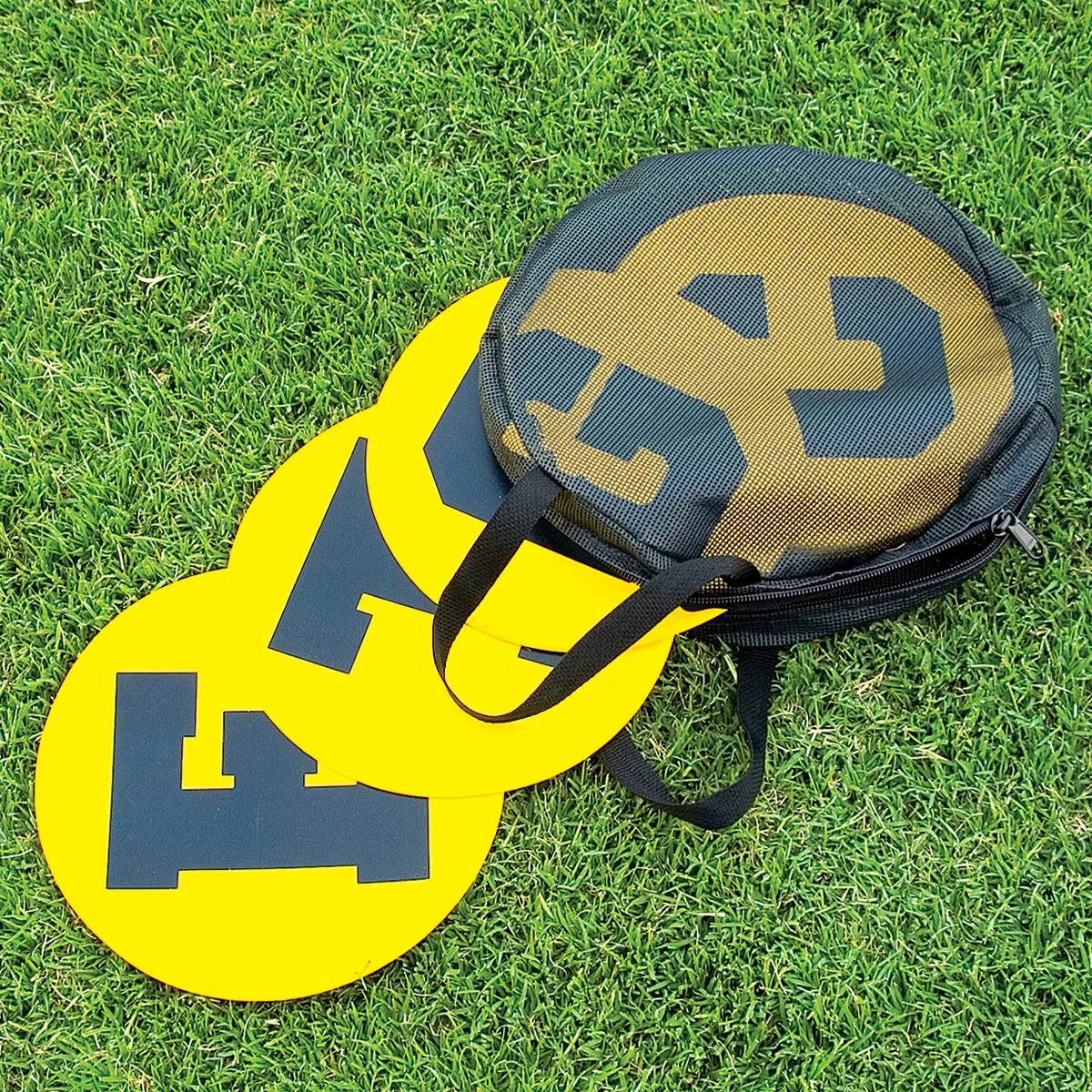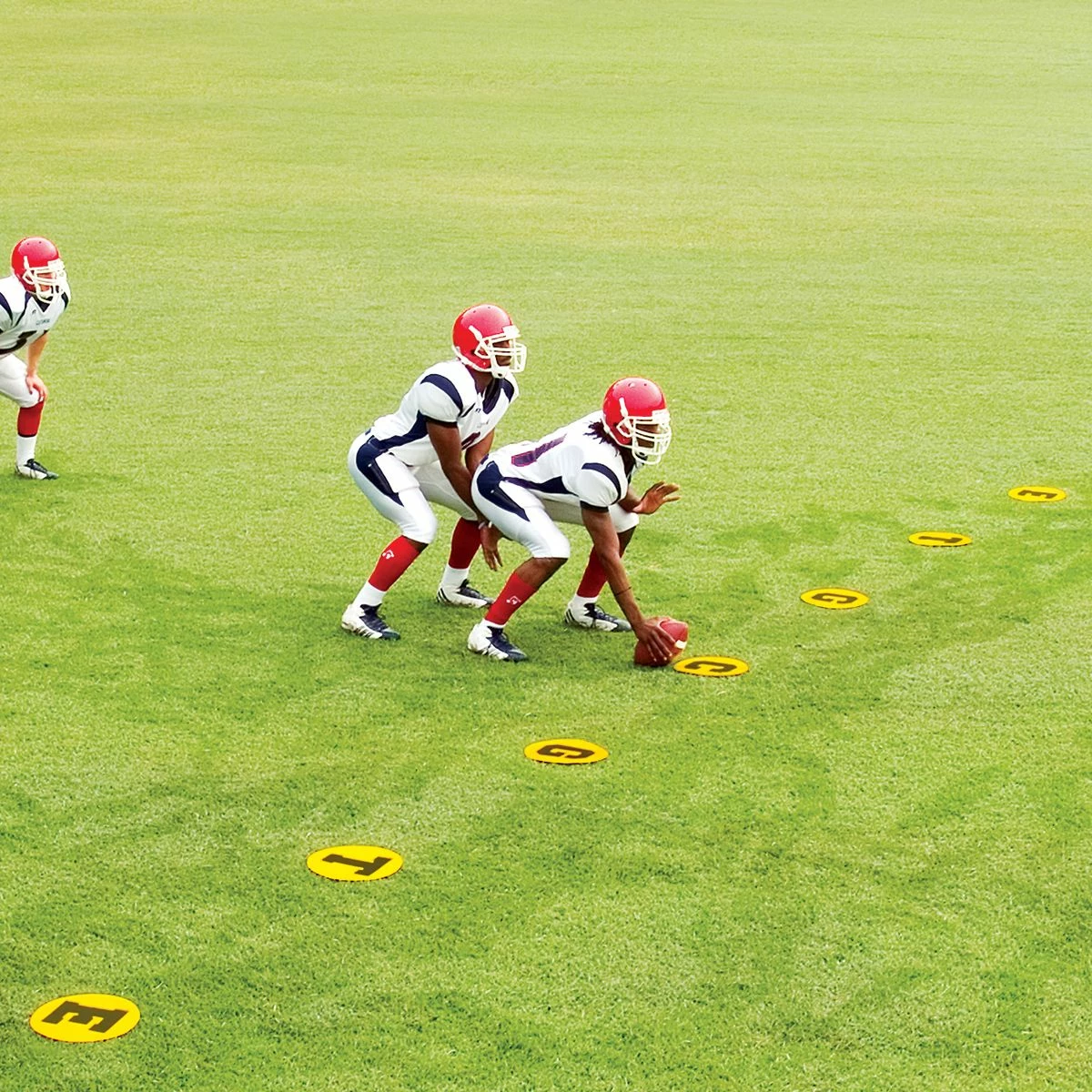 The Fisher LUDSC football line up disks are constructed from molded flexible rubber and measure 12″ in diameter making them a sturdy and highly visible way to direct your offensive practice. The top side has letters for positioning and the the disks can be used for other drills when flipped over to the solid yellow side. The set comes complete with a mesh carry bag.