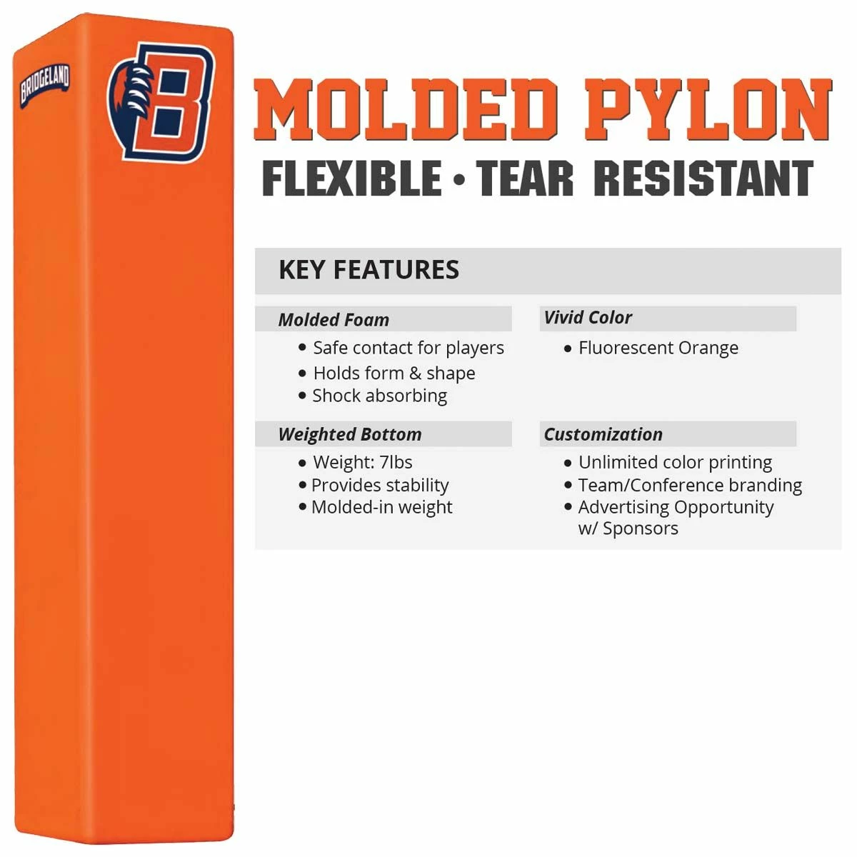 The molded end zone pylons from Fisher are flexible and tear resistant, holding up to the toughest hits during a game. Enhance the look of your end zone by adding your team or conference logo to the pylons, included at no extra charge. There are unlimited color options available for your custom design. Just email us your artwork to get the ball rolling. These fluorescent orange pylons are offered in sets of 4, 8, or 12 and are constructed with molded foam that holds its shape while being extra shock absorbing and safe when players make contact. The weighted bottoms provide stability so you don’t have to worry about them falling over on their own.