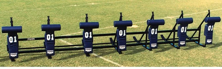 This Fisher CL JV 7 man sled is ideal for middle school through high school programs because of its TITE-LOCK modular chassis that provides the rigidity needed in a multi-unit sled. Player safety is improved due to the wraparound design of the T Pads.The main frame is tough, durable and guaranteed to last for 5 years. The all metal surfaces are powder coated to prevent rust and the leaf spring design virtually eliminates all spring cracking and breaking. The 30 degree angle on the skids assures you of a smooth transition over your field without chewing up your turf or grass. The high density, 100lb impact resistant foam is covered with durable 18oz vinyl covers that are then double and triple stitched to withstand harsh weather and years of hard use.