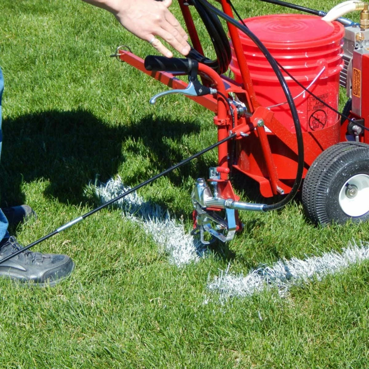 The EcoLiner SP is a self-propelled field striping machine that features a heavy duty, 45 psi diaphragm pump coupled directly to Briggs & Stratton engine with Oil Alert, making the simple friction drive system foolproof and easy to maintain. This machine is easy to use as there is no messing pouring, even when changing color. Simply place a standard 5-gallon pail of premixed paint in the machine and you are ready to paint your field. There is no hazardous pressurized tank allowing operation to be completely safe. With the recirculating pump, you will never stop to stir the paint again. This versatile machine has a detachable spray gun with a 12 foot hose that allows you to paint stencils or hard to reach areas. There is also an optional rear caster to spray arcs and circles. Cleanup is very easy as all you have to do is remove the pail, reseal it for future use, pump a little clear water through the system of this field painting equipments, and you are ready for the next use. The EcoLiner SP features a large replaceable foot filter on the intake hose to prevent a clogged tip or filter. This machine is built to last as it is American made, constructed of welded steel and quality components.
