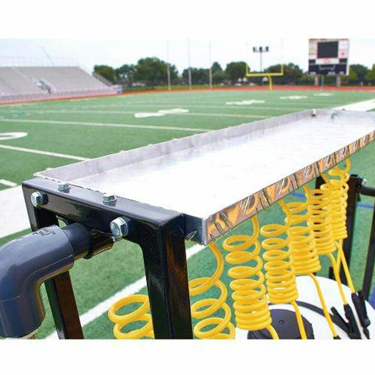 Keep the whole team hydrated with the Power Tanker with cart. Equipped with a 35-gallon tank and eight drinking stations, this drinking station features coiled PVC non-corrosive drinking tubes that retract to avoid tangling when multiple players are drinking simultaneously. The adjustable pressure valve on each coil maintains a steady flow of water when open and delivers quick shut-off when the player is ready to get back out on the field. The four 10 in. pneumatic tires promote smooth riding and steering down the length of the field to ensure the cart is there when the players need hydration. A powdercoat steel frame and aluminum deck stand up to countless practices and games. Adjustable shut-offs are powered by a 12-volt, 12-amp rechargeable battery that runs for up to eight hours on a single charge.