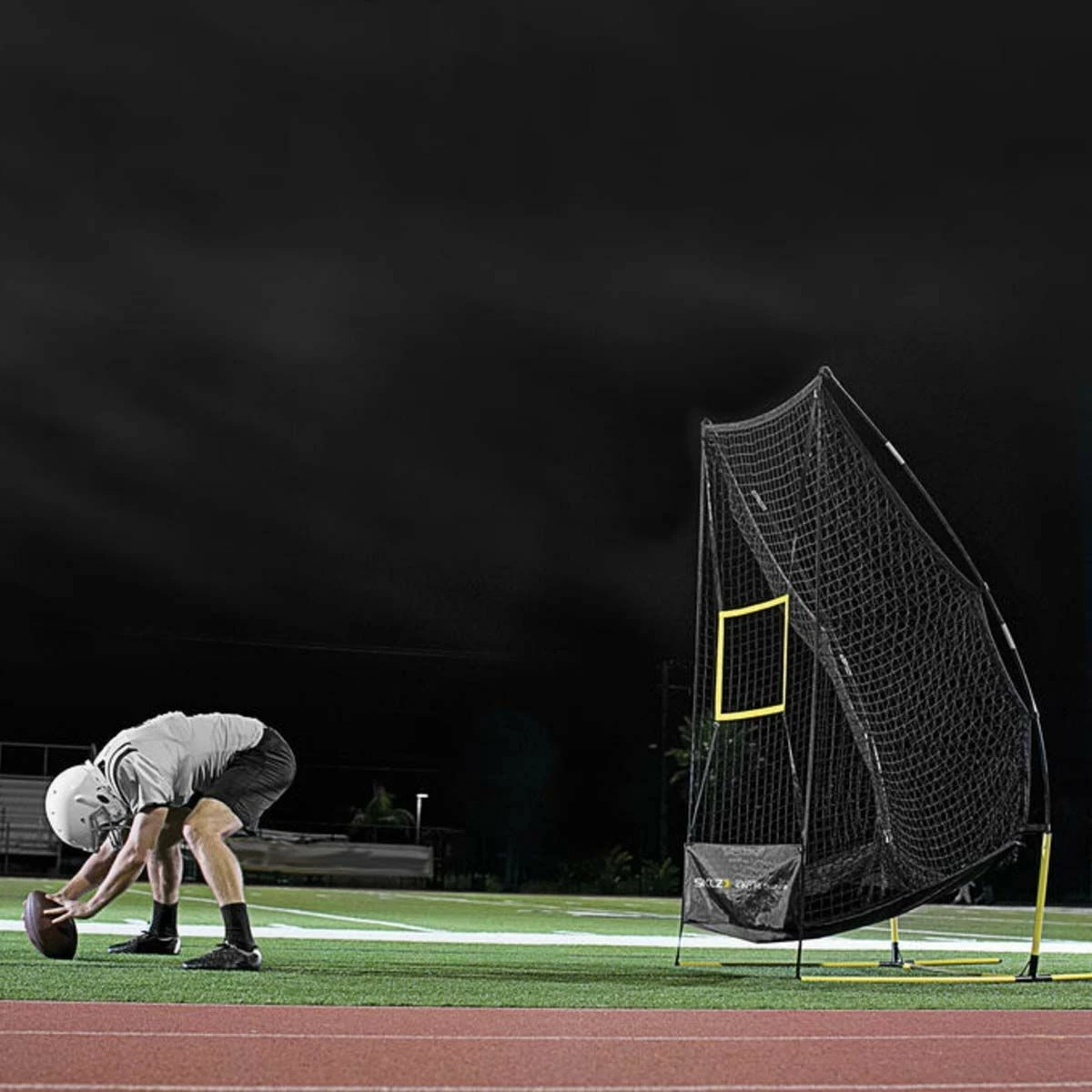 The SKLZ Quickster® 4-in-1 football trainer allows you to work on multiple skills like punting, passing, kicking and ball snapping. Snap or throw like a pro with the included hi-viz target and all-weather catch net that keeps balls clean throughout your practice. Pre-connected poles allow for easy assembly. Heavy-duty netting with a composite steel and fiberglass frame offers strength and durability. The Quickster 4-in-1’s lightweight, portable design allows you to train on the go.