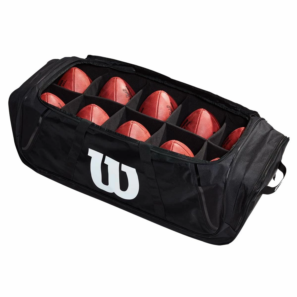 Wilson’s 10-ball football duffle bag keeps footballs warm and dry in all weather conditions. The bag has removable EVA dividers and a water resistant bottom. Protect your game balls from scuffing in the fleece lined ball compartments. The bag has a durable 600 denier polyester construction that is rugged enough to last season after season.